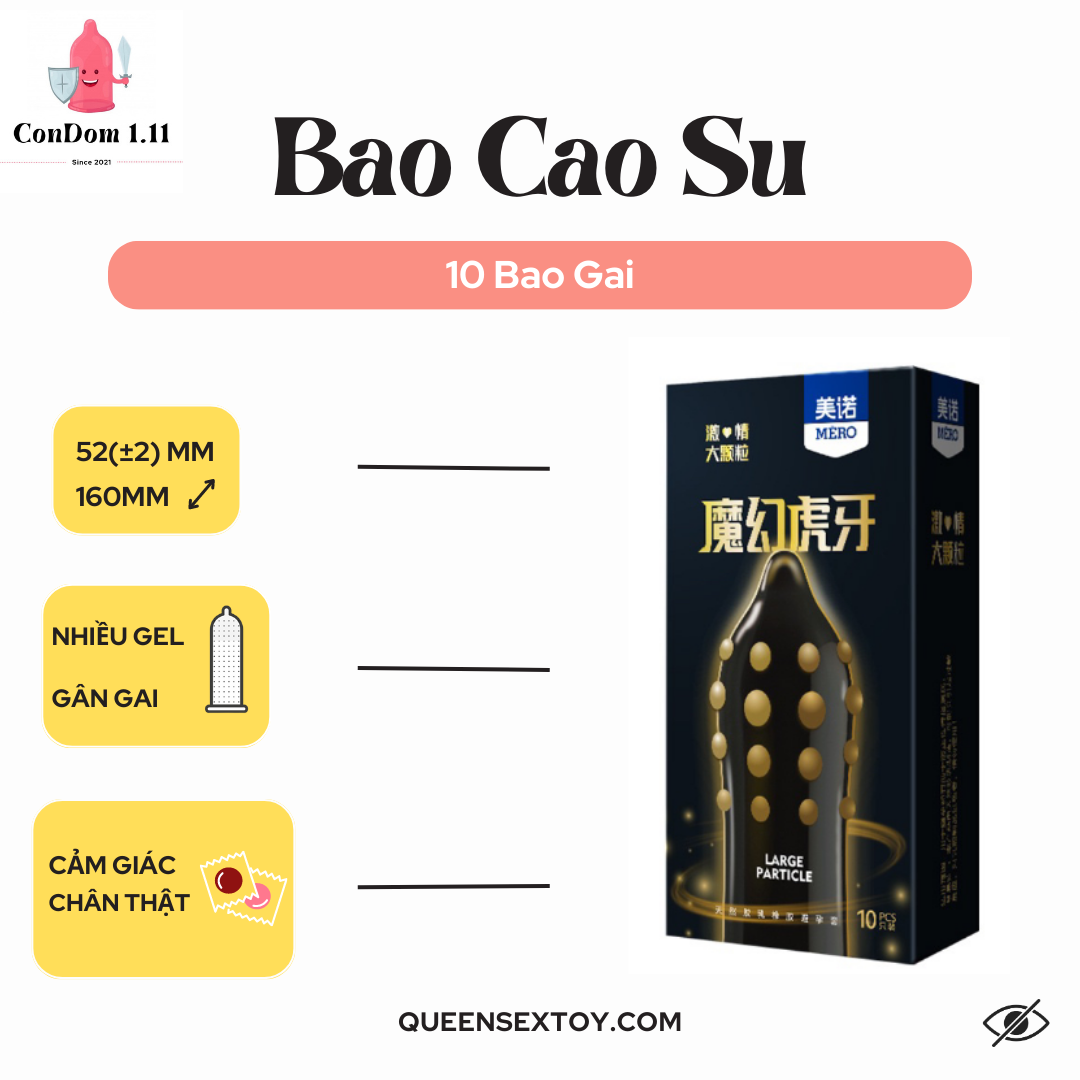 ✔ Bao cao su gai với ưu điểm lớn nhất là hệ thống gai xung quanh bao, Gai không quá lớn nhưng đủ giúp chàng chinh phục nàng và cô bé của nàng. Bao cao su gai Mero với độ mỏng cao làm cho chàng cảm nhận thực hơn trong quá trình quan hệ. Do đó với sản phẩm bao cao su này, các đấng mày râu sẽ nắm thế chủ động hoàn toàn trong cuộc yêu
